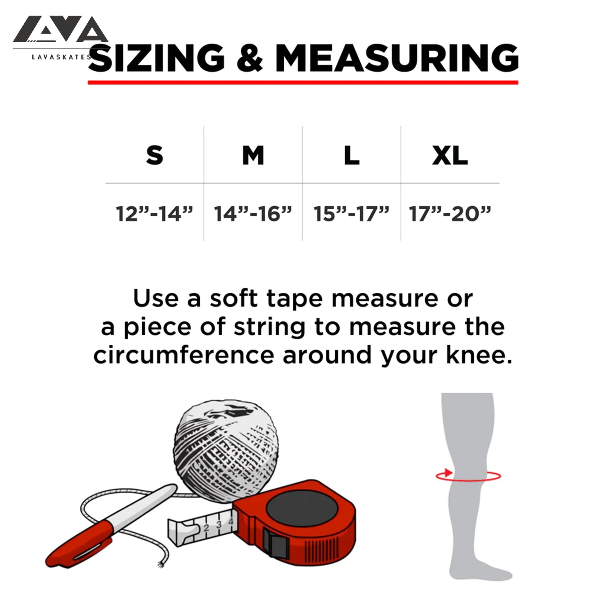 To ensure a perfect knee pad fit, measure circumference of extended knee and match to the sizes listed below: