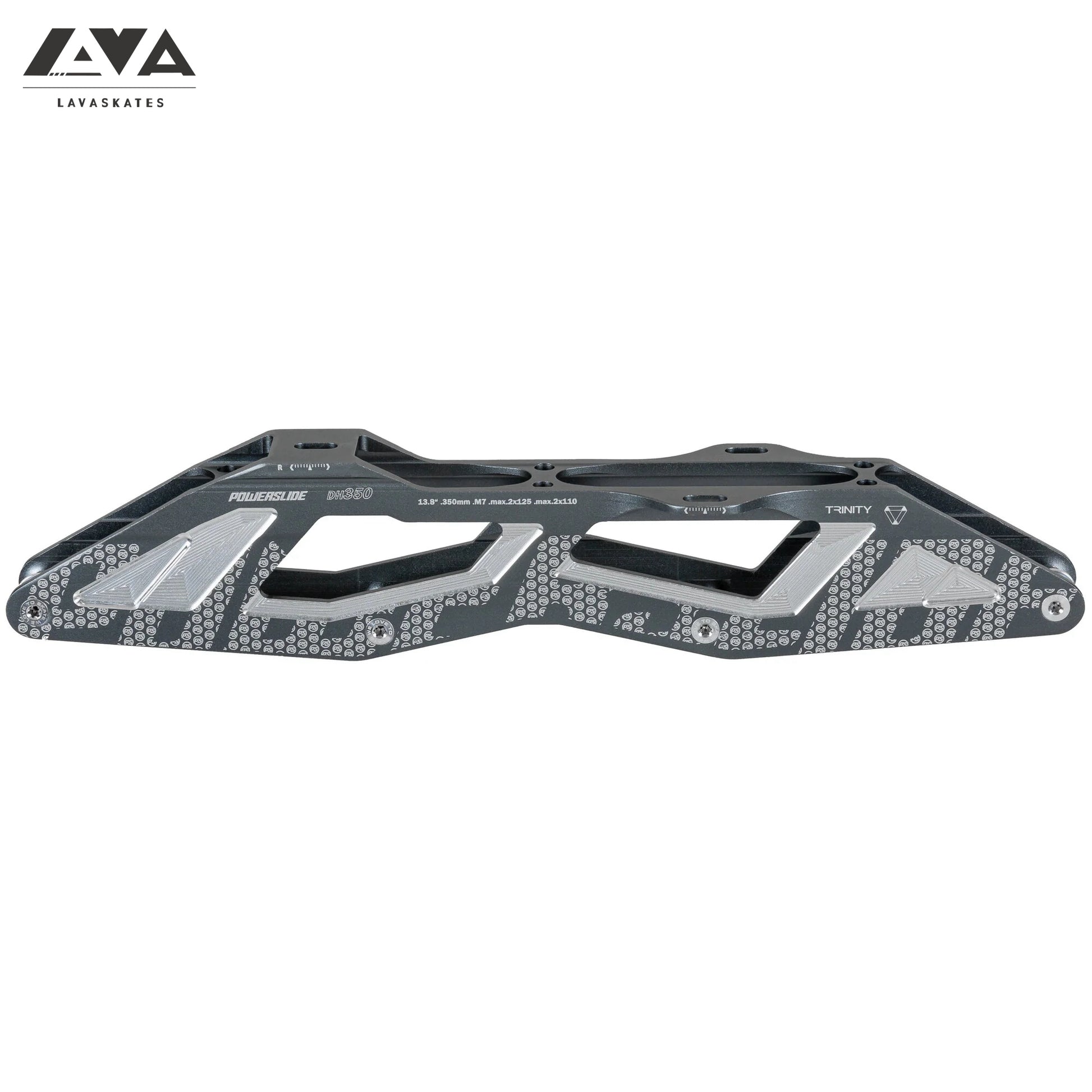 It’s the fastest dowhill inline skating frame and the only frame to consider when you’re looking for all-out, extreme speed and ultimate performance - say hello to the DH350 frame from POWERSLIDE. The POWERSLIDE DH350 frame is designed around a whole new downhill sheds the traditiona 5x90mm wheels setup and instead offers a unique 125-110-110-125 four-wheel setup to boost your performance. By offering larger wheels, skaters can increase speed and responsiveness while you’re streaking down the hill, passing your competition, and heading for the finish line. The POWERSLIDE DH350 frame with it’s innovative 125mm/110mm wheel combination also incorporates the famous TRINITY 3-point mounting system. The TRINITY system with its front wings forms a channel that brings the wheels close to the boot which lowers the center of gravity while improving stability and control. Made of extruded and CNC machined 6061 aluminum, the POWERSLIDE DH350 frame is lightweight and super strong, ideal for intense, demanding races. Ready to beat your personal best and win your next downhill race? You have to try the POWERSLIDE DH350 frame.